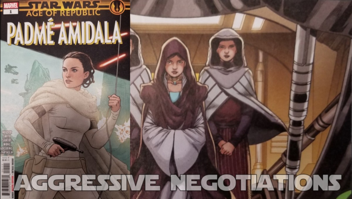 E.K. Johnston’s Star Wars: Queen’s Shadow introduced me to Padmé’s Handmaidens and the details of the resurrected Naboo tradition of the Royal decoy system. This comic features Moteé, who is not featured in the book, as I recall. I wonder if she is being set up here for use in future stories. The Handmaidens are rich characters who have a lot of potential; it was a lot of fun to see them featured here. Queen’s Shadow features very little action but it works well because the intrigue and political maneuvering can convey tension separate from immediate physical threat or danger. That works especially well in a book, less so in a comic book. I think this comic suffered a little from being a modicum too much like the YA novel.